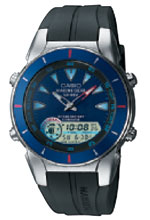 Часы наручные, мужские, корпус стальной, ремешок из полимерного материала, стекло минеральное (сферическое), циферблат аналогово-цифровой (синий), со светодиодной подсветкой + специальное покрытие (необрит), 12/24-часовой формат времени, полностью автоматический календарь, функция мировое время, секундомер, яхт-таймер, будильник (3) с повтором сигнала, функция отображения возраста луны и таблица приливов-отливов, водозащита 10 BAR.